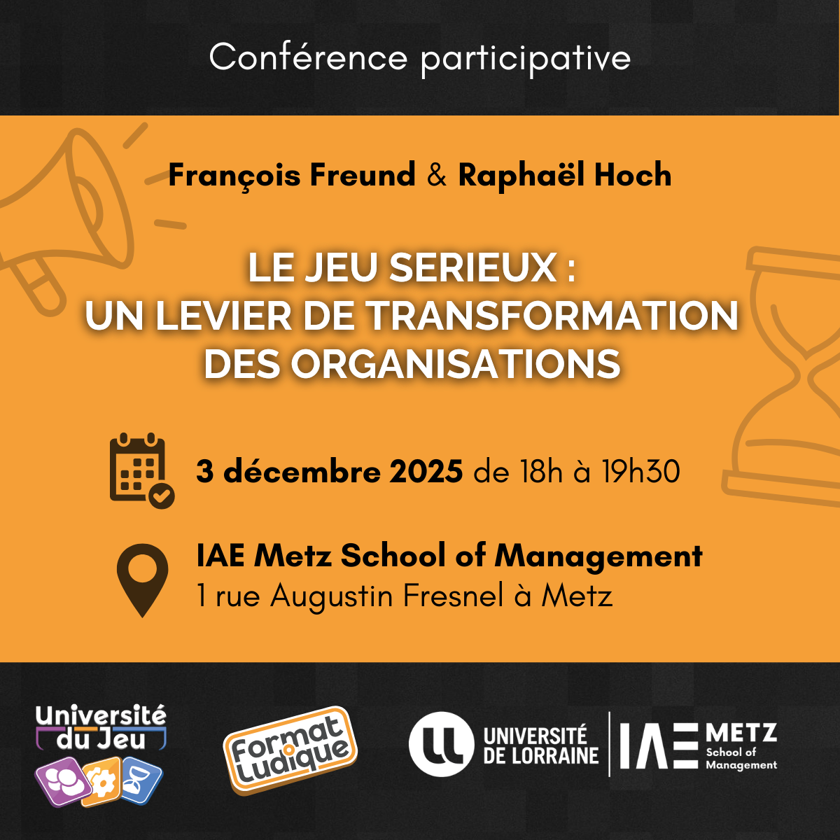 Le 3 décembre prochain, nous animerons une conférence et un temps de réflexion collective à l’IAE de Metz, sur les jeux sérieux et leur impact dans les organisations.